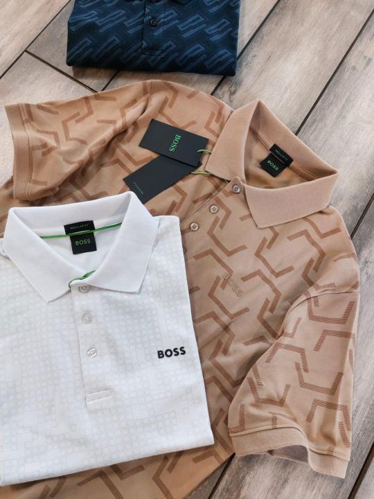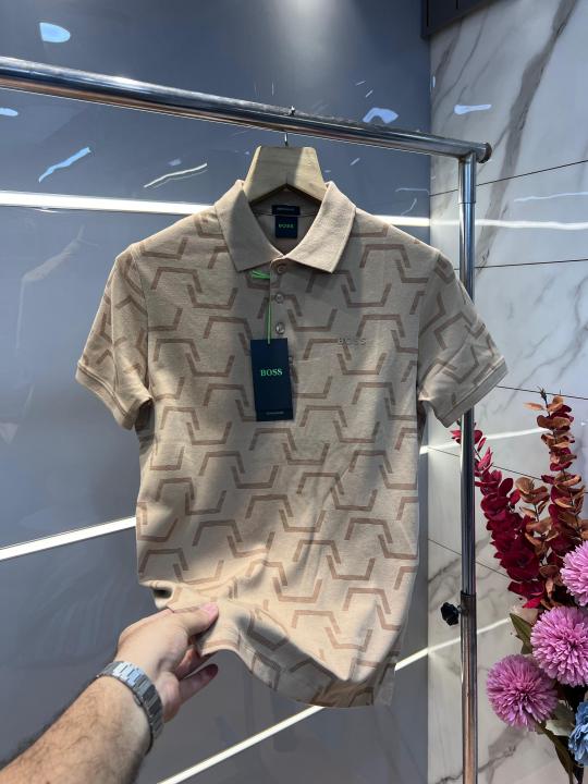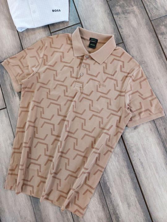 Hugo Bos s Cream Premium 240 gsm interlock cotton fabric Polo Tshirt with Allover Monogram Printed and Emboss Logo 3156