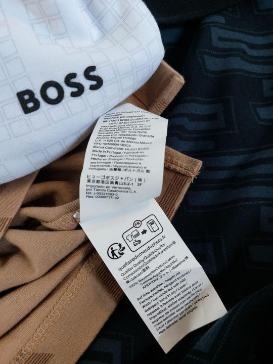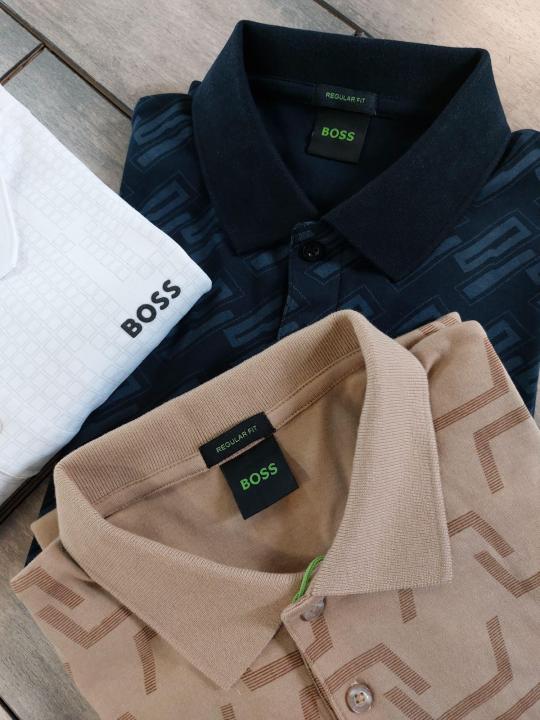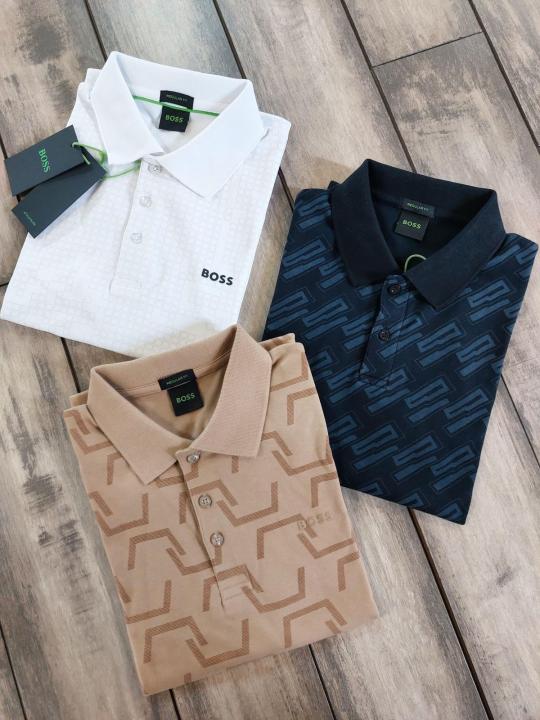 Hugo Bos s White Premium 240 gsm interlock cotton fabric Polo Tshirt with Allover Monogram Printed and Emboss Logo 3155