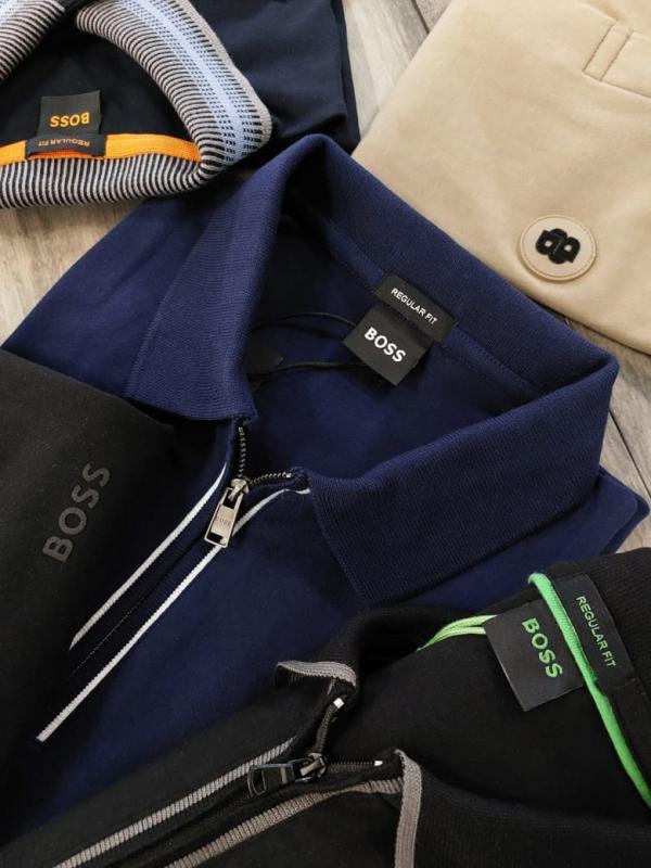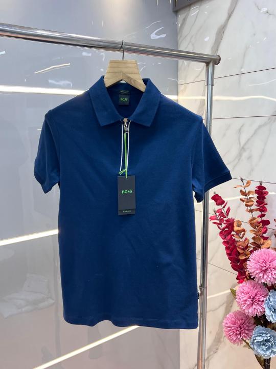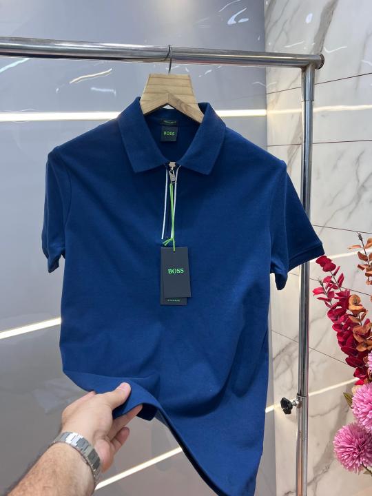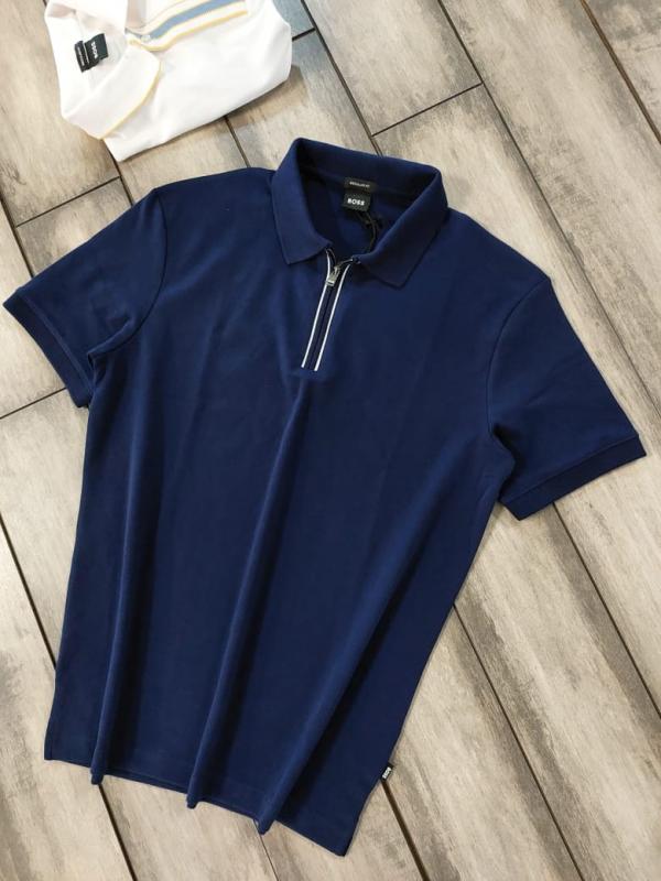 Home T-Shirts Hugo Bos s Navy Premium 240 gsm interlock compact cotton fabric Polo Tshirt with Front Design and Zip Style 3273