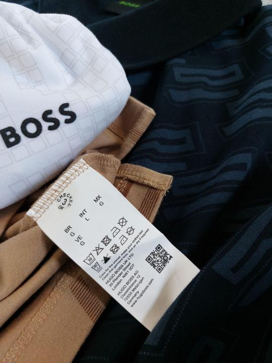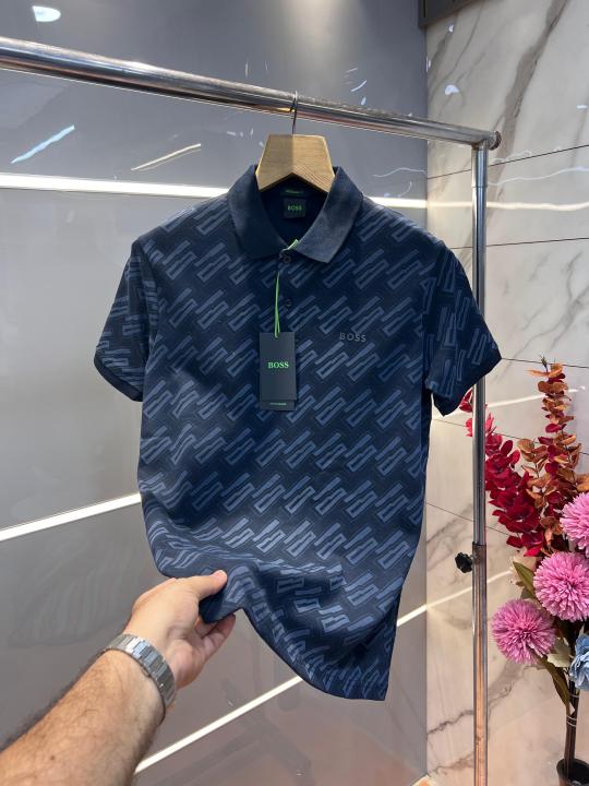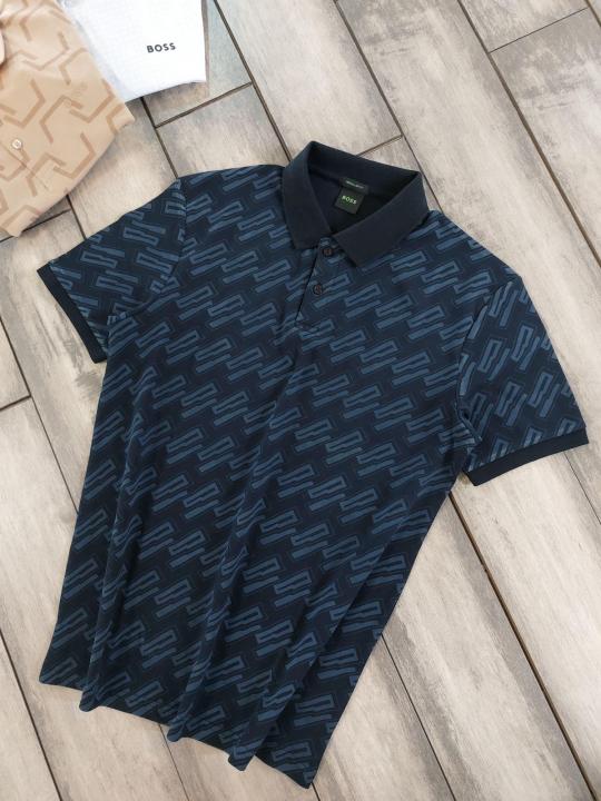 Hugo Bos s Navy Premium 240 gsm interlock cotton fabric Polo Tshirt with Allover Monogram Printed and Emboss Logo 3154