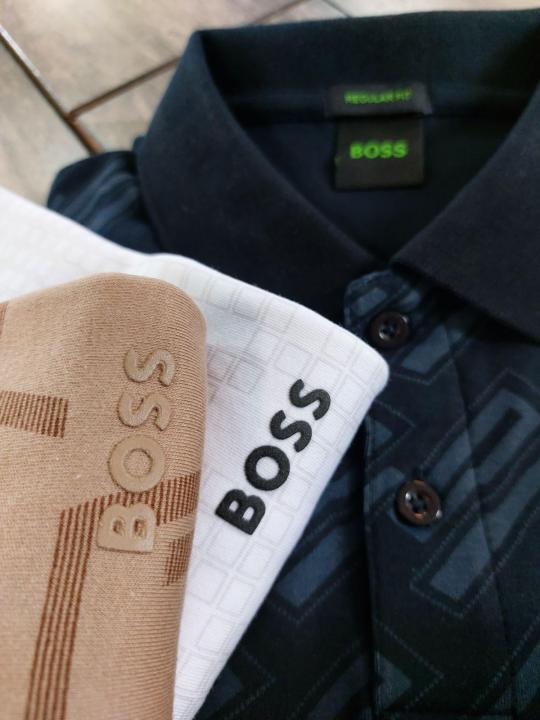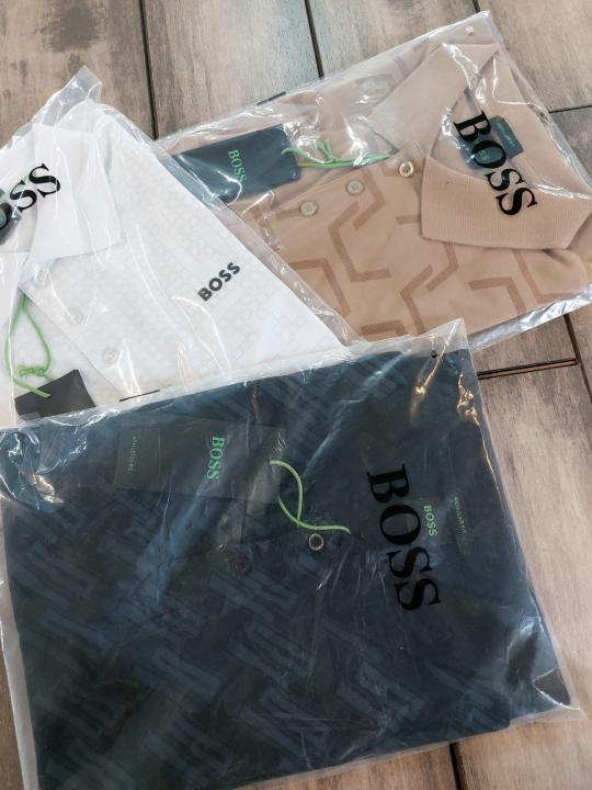 Hugo Bos s White Premium 240 gsm interlock cotton fabric Polo Tshirt with Allover Monogram Printed and Emboss Logo 3155