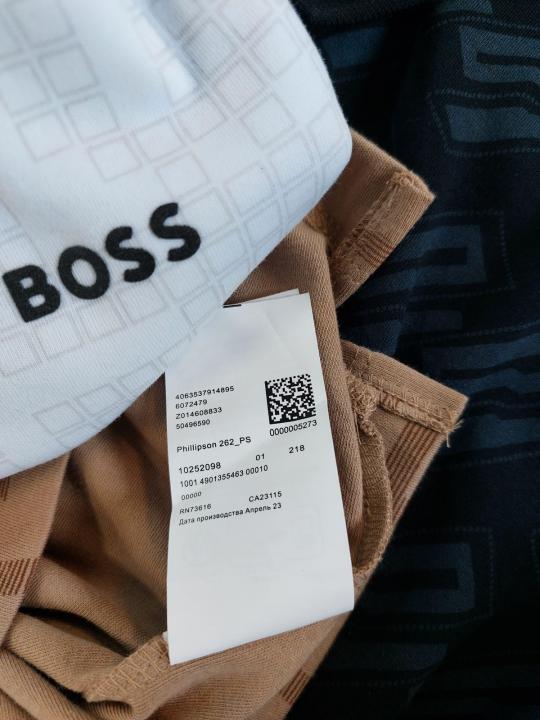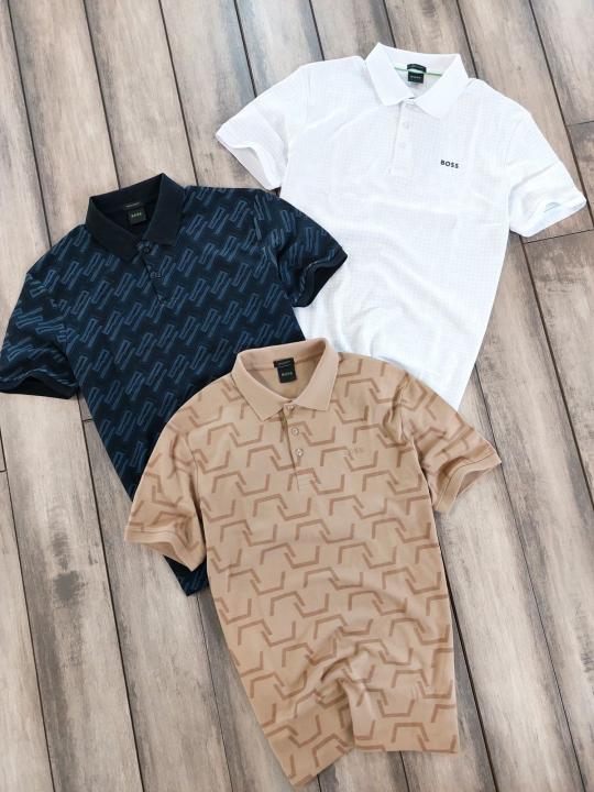 Hugo Bos s Cream Premium 240 gsm interlock cotton fabric Polo Tshirt with Allover Monogram Printed and Emboss Logo 3156